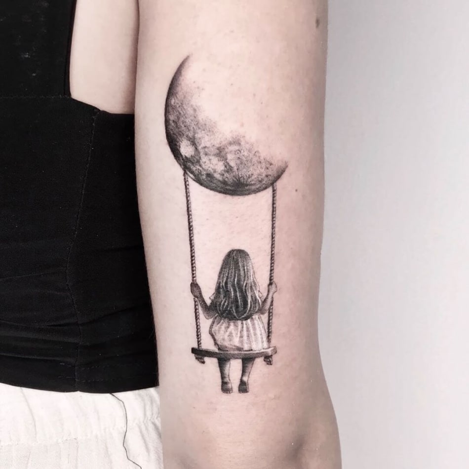 Swinging on the moon tattoo design is a great way to express your feelings for someone. This style of tattoo might reflect a strong bond you have with someone, or it can serve as a recall of a wonderful occasion you shared. Swinging on the moon tattoos can be beautiful and unique, regardless of their meaning. Other planets reflect inclusion as well.